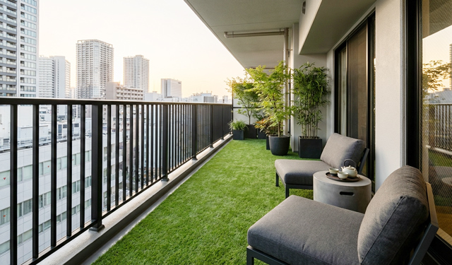 コンクリートのままでは無機質で殺風景になりがちなバルコニーも、人工芝を敷くだけで緑が加わり、くつろげる空間に変わります。