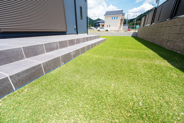 ちょっとリッチな対策ですが、人工芝の一部にタイルテラスを作るのもおすすめ。これから、人工芝を敷こうと考えている人にも有効的な手段です。